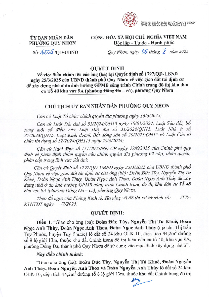 Tiêu đề văn bản | [1205/QĐ-UBND - 06/08/2025] v/v điều chỉnh tên các ông (bà) tại Quyết định số 1797/QĐ-UBND ngày 25/3/2025 của UBND TP Quy Nhơn | ||
