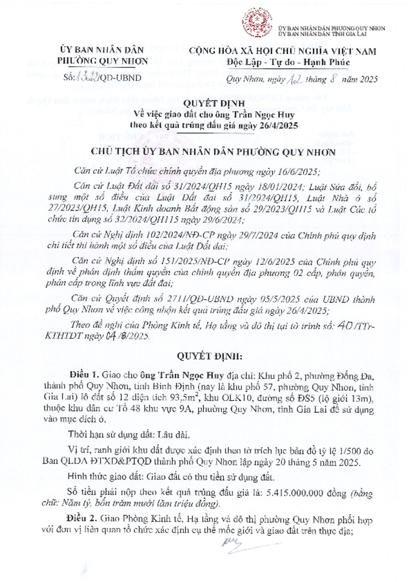 Tiêu đề văn bản | [1322/QĐ-UBND - 12/08/2025] v/v giao đất ở cho ông (bà): Trần Ngọc Huy theo kết quả trúng đấu giá ngày 26/4/2025 | ||