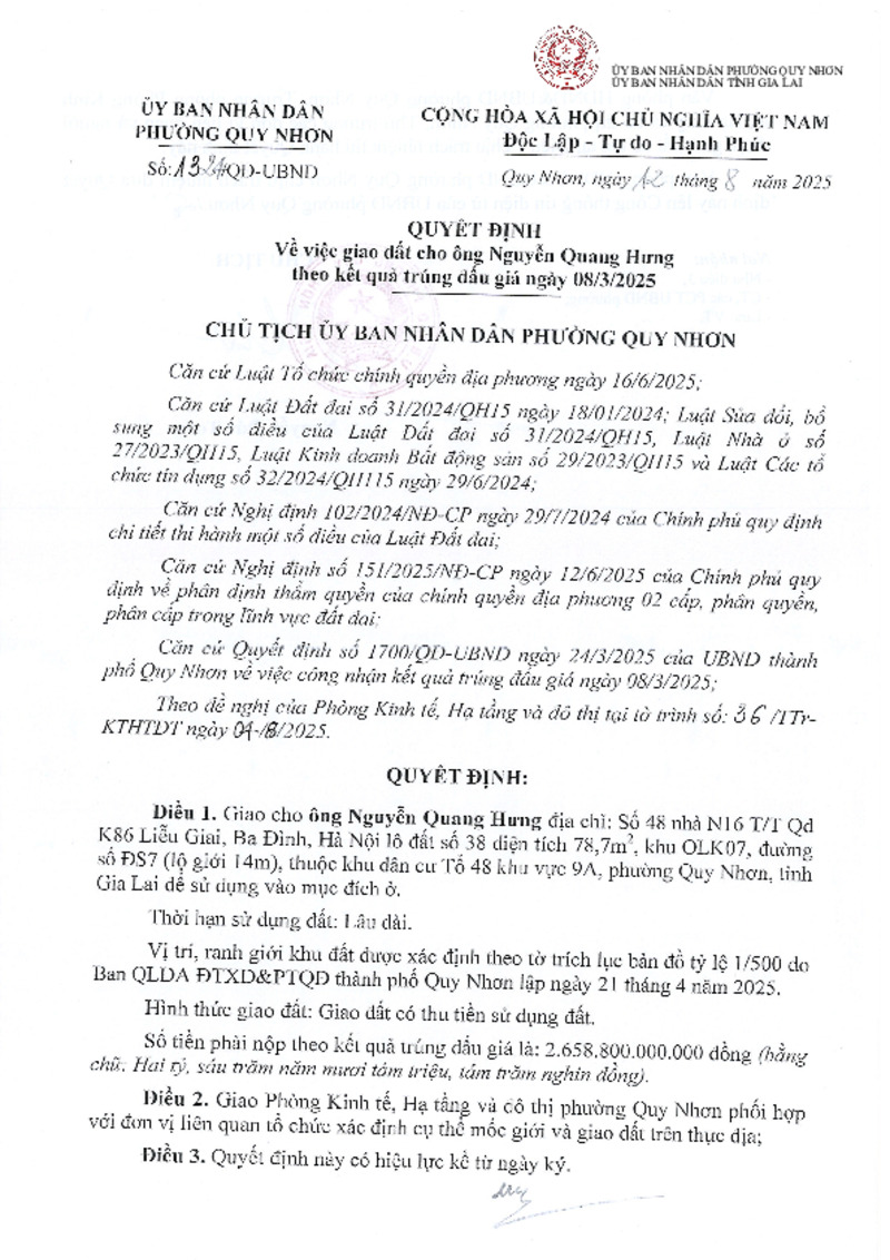 Tiêu đề văn bản | [1324/QĐ-UBND - 12/08/2025] v/v giao đất ở cho ông (bà): Nguyễn Quang Hưng theo kết quả trúng đấu giá ngày 08/3/2025 | ||