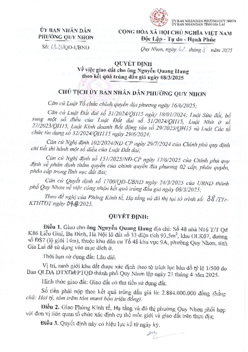 Tiêu đề văn bản | [1325/QĐ-UBND - 12/08/2025] v/v giao đất ở cho ông (bà): Nguyễn Quang Hưng theo kết quả trúng đấu giá ngày 08/3/2025 | ||