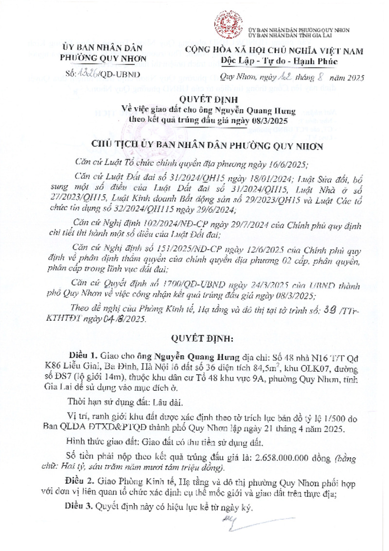 Tiêu đề văn bản | [1326/QĐ-UBND - 12/08/2025] v/v giao đất ở cho ông (bà): Nguyễn Quang Hưng theo kết quả trúng đấu giá ngày 08/3/2025 | ||